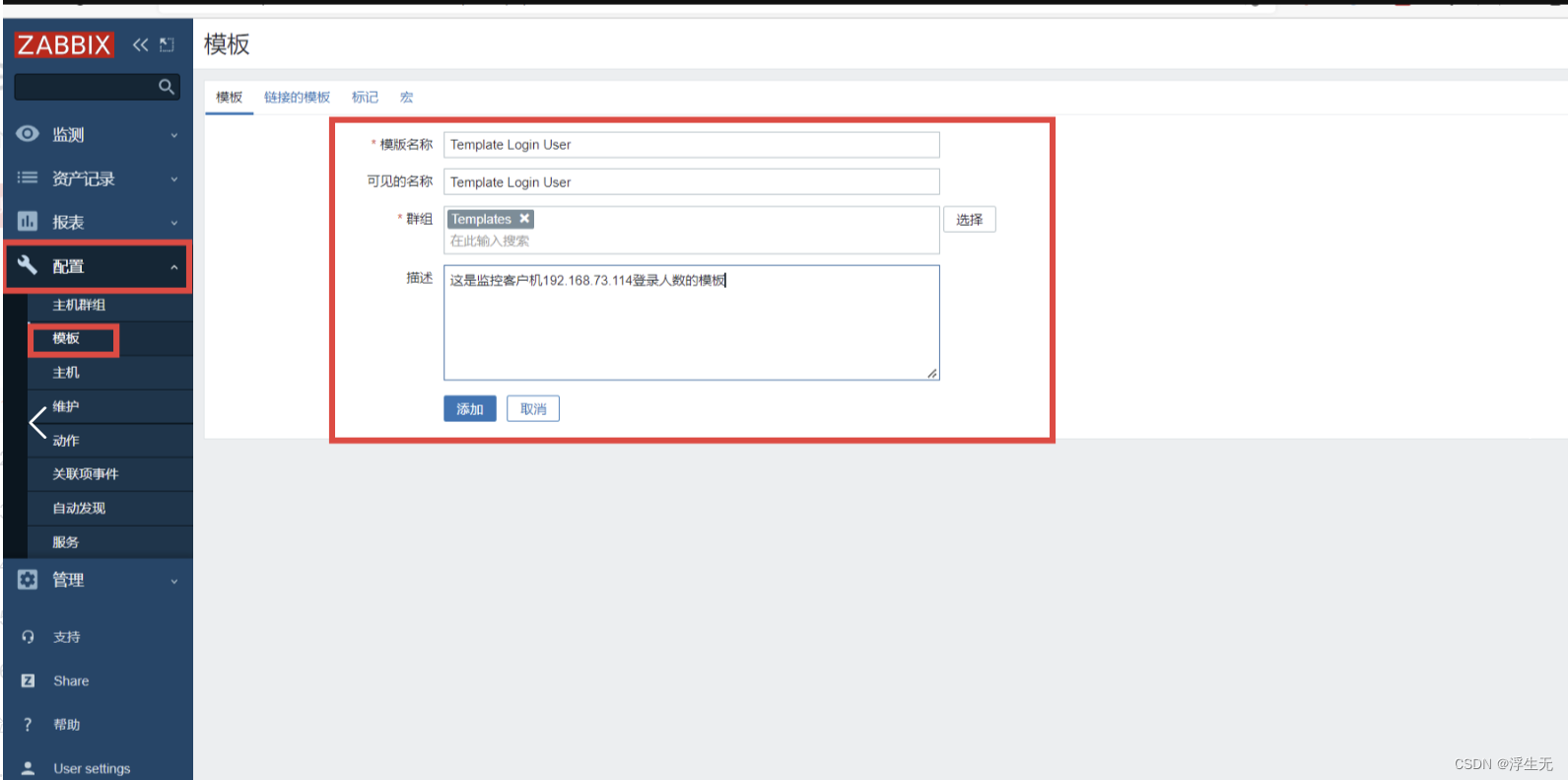 点击左边菜单栏【配置】中的【模板】,点击【创建模板】