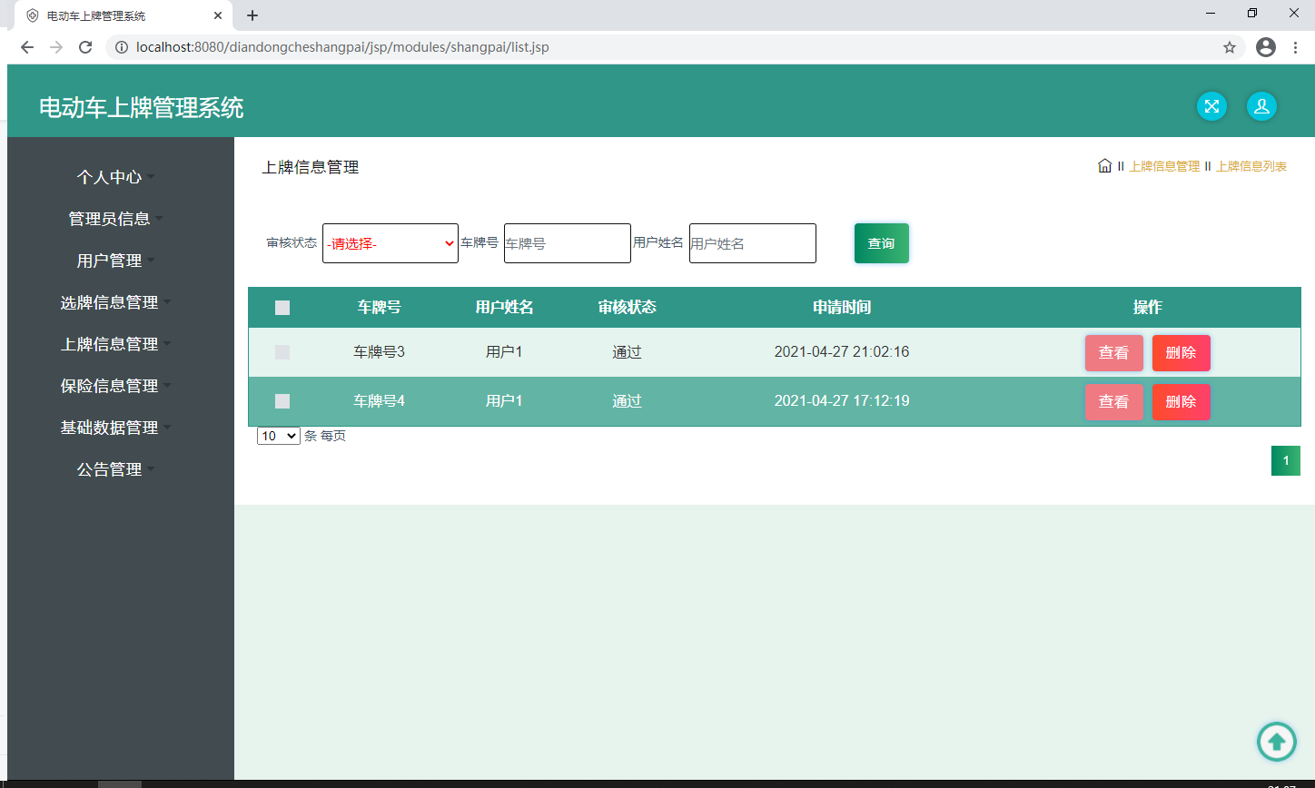 如图5.3显示的就是上牌信息管理页面,此页面提供给管理员的功能有:根据上牌信息进行条件查询,还可以对上牌信息进行审核、删除、查询操作等等。