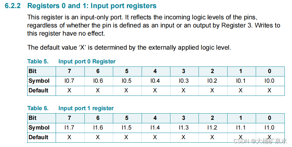 这里对于IO默认高电平的情况进行说明,目前配置输入模式时IO在浮空情况下默认有上拉,在实际测试输入时会根据实际高低电平进行状态读取,这里我尝试使用PI寄存器对输入极性反转设置,但是经过尝试发现极性反转只是输入数据的变化,电平还是上拉该点评,而且极性反转高电平显示数据0,低电平显示数据1,也不太适应,暂不需求,所以PI寄存器按需配置