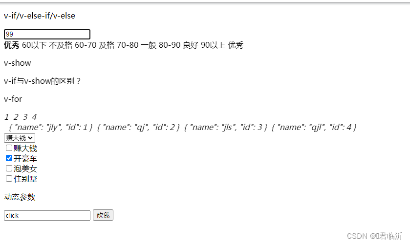 与v-if类似,只是会渲染其身后表达式为false的元素,而且会给这样的元素添加css代码:style="display:none"