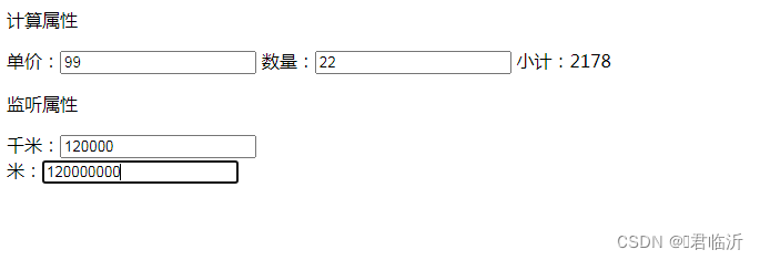 千米:<input v-model="km" /><br />