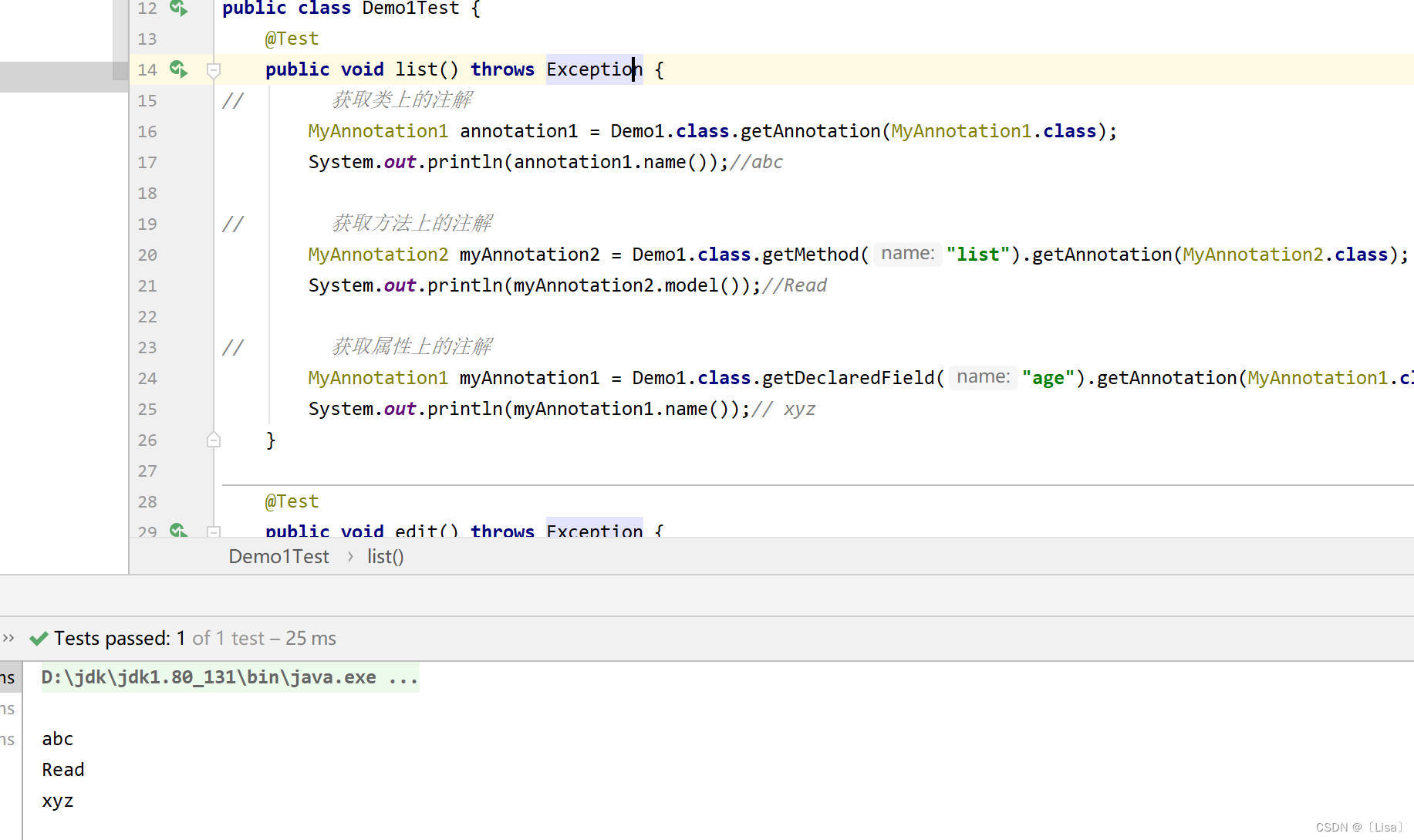 package com.liyongan.annotation.demo1; import com.liyongan.annotation.MyAnnotation1; import com.liyongan.annotation.MyAnnotation2; import com.liyongan.annotation.MyAnnotation3; import com.liyongan.annotation.TranscationModel; import org.junit.jupiter.api.Test; /** */ public class Demo1Test { @Test public void list() throws Exception { // 获取类上的注解 MyAnnotation1 annotation1 = Demo1.class.getAnnotation(MyAnnotation1.class); System.out.println(annotation1.name());//abc // 获取方法上的注解 MyAnnotation2 myAnnotation2 = Demo1.class.getMethod("list").getAnnotation(MyAnnotation2.class); System.out.println(myAnnotation2.model());//Read // 获取属性上的注解 MyAnnotation1 myAnnotation1 = Demo1.class.getDeclaredField("age").getAnnotation(MyAnnotation1.class); System.out.println(myAnnotation1.name());// xyz } @Test public void edit() throws Exception { MyAnnotation3 myAnnotation3 = Demo1.class.getMethod("edit").getAnnotation(MyAnnotation3.class); for (TranscationModel model : myAnnotation3.models()) { System.out.println(model);//Read,Write } } } Demo1目的:我们用来获取类注释上的类与方法上的注解值: