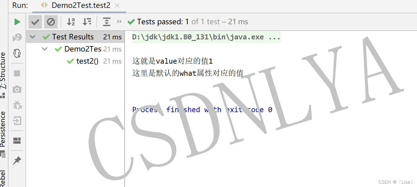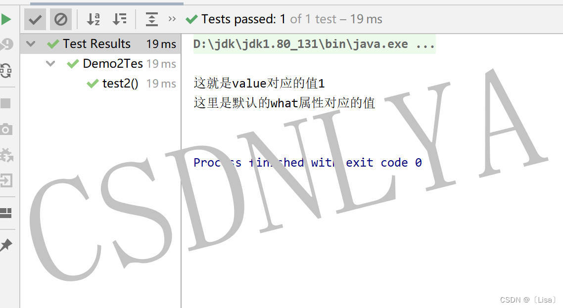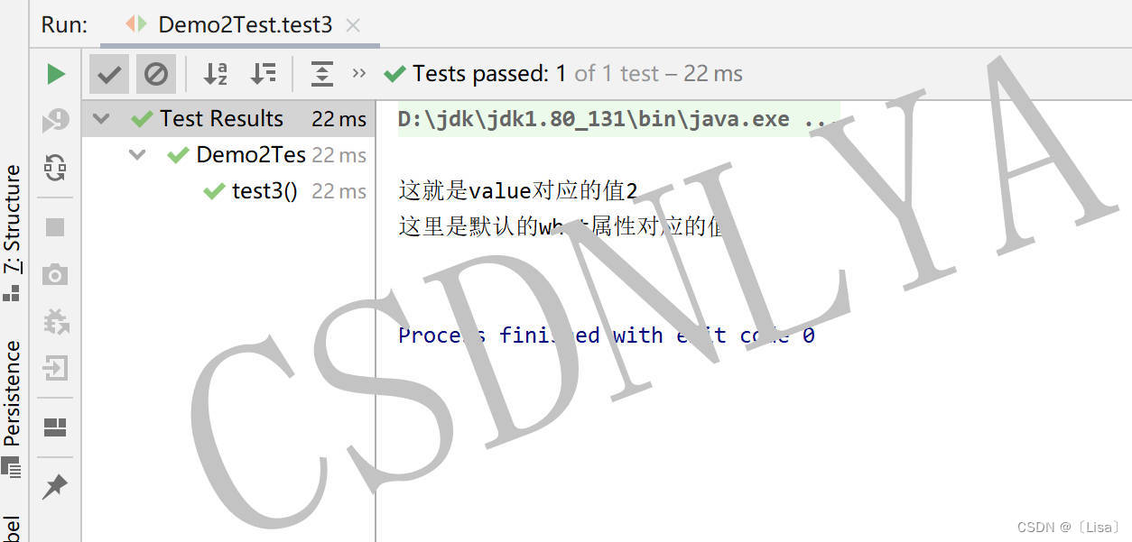 package com.liyongan.annotation.demo2; import com.liyongan.annotation.demo1.TestAnnotation; /** * 获取类属性上的注解属性值 */ public class Demo2 { @TestAnnotation(value = "这就是value对应的值_msg1", what = "这就是what对应的值_msg1") private static String msg1; @TestAnnotation("这就是value对应的值1") private static String msg2; @TestAnnotation(value = "这就是value对应的值2") private static String msg3; @TestAnnotation(what = "这就是what对应的值") private static String msg4; }Demo2Test:
