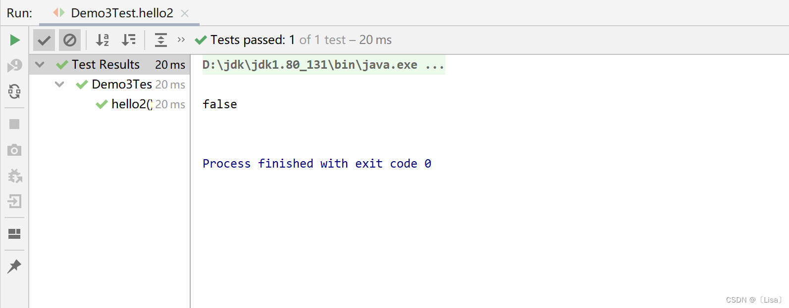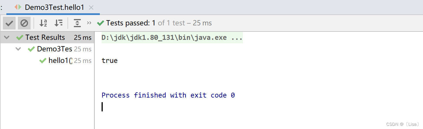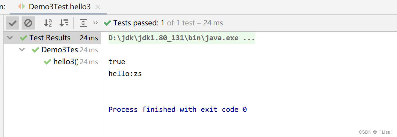 public class Demo3Test { @Test public void hello1() throws Exception { Demo3 demo3 = new Demo3(); for (Parameter parameter : demo3.getClass().getMethod("hello1", String.class).getParameters()) { IsNotNull annotation = parameter.getAnnotation(IsNotNull.class); if(annotation != null){ System.out.println(annotation.value());//true } } } @Test public void hello2() throws Exception { Demo3 demo3 = new Demo3(); for (Parameter parameter : demo3.getClass().getMethod("hello2", String.class).getParameters()) { IsNotNull annotation = parameter.getAnnotation(IsNotNull.class); if(annotation != null){ System.out.println(annotation.value());//false } } } @Test public void hello3() throws Exception { // 模拟浏览器传递到后台的参数 解读@requestParam String name = "zs"; Demo3 demo3 = new Demo3(); Method method = demo3.getClass().getMethod("hello1", String.class); for (Parameter parameter : method.getParameters()) { IsNotNull annotation = parameter.getAnnotation(IsNotNull.class); if(annotation != null){ System.out.println(annotation.value());//true if (annotation.value() && !"".equals(name)){ method.invoke(demo3,name); } } } } }运行test1方法结果: