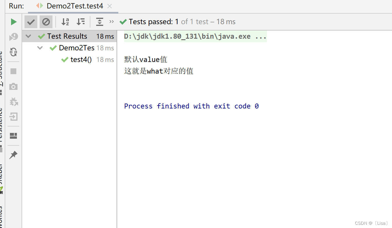 package com.liyongan.annotation.demo2; import org.junit.jupiter.api.Test; public class Demo2Test { @Test public void test1() throws Exception { TestAnnotation msg1 = Demo2.class.getDeclaredField("msg1").getAnnotation(TestAnnotation.class); System.out.println(msg1.value()); System.out.println(msg1.what()); } @Test public void test2() throws Exception{ TestAnnotation msg2 = Demo2.class.getDeclaredField("msg2").getAnnotation(TestAnnotation.class); System.out.println(msg2.value()); System.out.println(msg2.what()); } @Test public void test3() throws Exception{ TestAnnotation msg3 = Demo2.class.getDeclaredField("msg3").getAnnotation(TestAnnotation.class); System.out.println(msg3.value()); System.out.println(msg3.what()); } @Test public void test4() throws Exception{ TestAnnotation msg4 = Demo2.class.getDeclaredField("msg4").getAnnotation(TestAnnotation.class); System.out.println(msg4.value()); System.out.println(msg4.what()); } }运行test1方法结果: