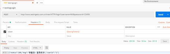 过程:执行完步骤1)->在登录接口的Headers中设置token变量值->发送请求。