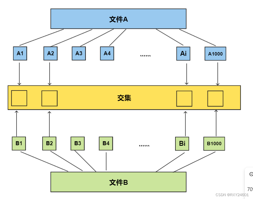 如上图,分别将大文件AB各划分为1000个长度不同的小文件,分别对相同下标的小文件求交集,找到的就是交集